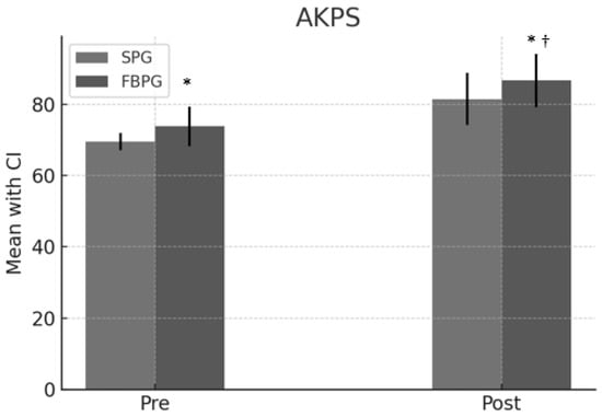 Kujala Anterior Knee Pain Scale (AKPS). * Statistical difference pre-post intervention. † Statistical difference between groups.