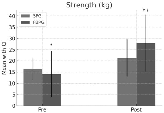 Regarding strength, measured in kilograms, significant improvements were observed in both groups. The SPG improved from an average of 16.3 [CI: 15.5, 25.1] to 21.3 [CI: 18.5, 35.1], and the FBPG from 14.1 [CI: 12.2, 32.6] to 27.9 [CI: 21.2, 46.6]. The mean difference between the groups was 6.6 [CI: 5.72, 7.48] in favor of the FBPG, with a p-value of 0.001 and an effect size of 3.22, suggesting significant superiority of FBPG in strength improvement. (Figure 4).