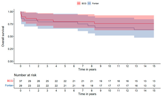 Overall survival was 82.6 ± 13.9% at 1 year, 79.0 ± 14.9% at 5 years, 67.2 ± 17.6% at 10 years and 63.2 ± 18.2 at 15 years for the FFG, and 86.1 ± 11.4% at 1 year, 79.5 ± 13.7% at 5 years, 75.7 ± 14.9% at 10 years, 75.7 ± 14.9% at 15 years for the BCG, with no statistically significant difference (Mantel Cox