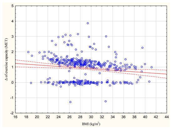 The increase in exercise capacity in METs significantly correlated with BMI at R = −0.1385, p < 0.05 (Figure 1).