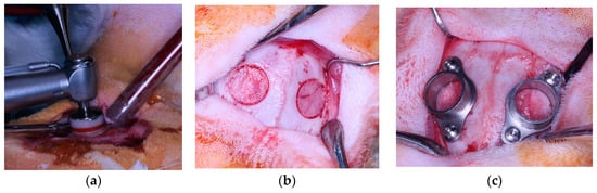 (a) Milling with an 8 mm diameter trephine with a stop to mark 0.5 mm; (b) 8 mm diameter defects without external cortex in both parietal bones; (c) fixing the titanium cylinders with an internal diameter of 6.9 mm and a height of 4 mm using two pins.