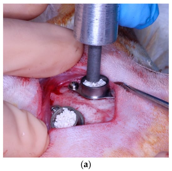 After preparing the working area and shaving and disinfecting the skin of the head of the rabbit to be operated on with povidone–iodine, a 5 cm long longitudinal incision was made in the medial area of the head, and a full-thickness flap was raised, exposing the parietal bones of the calvaria. To create defects in the calvaria, an 8 mm diameter trephine constantly irrigated with saline was used to delimit the circumference of the defect. The trephine was used with a stop to mark the desired depth, which was set at 0.5 mm to keep the inner cortex of the cranial bones intact. The external cortex of the working area was removed with a tungsten carbide round handpiece bur (HM141F 031, Meisinger, Neuss, Germany), resulting in two defects of 8 mm diameter and 0.5 mm depth with a medullary bone base. Using two pins (Bone Management Master-Pin-Control®, Meisinger, Neuss, Germany), titanium cylinders (Soadco S.L., Escaldes-Engordany, Andorra) designed specifically for this methodology and referenced in previous studies [] were fixed. This process is shown in Figure 1.