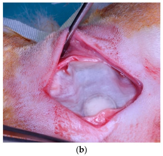 Both defects were filled with 0.105 g of particulate hydroxyapatite of bovine origin and sodium hyaluronate (Cerabone Plus®, Botiss Biomaterials GmbH, Zossen, Germany) with a particle size between 0.5 and 1.0 mm. The volume of graft added was verified to correspond to 112.18 mm3 to avoid too much variability in terms of the hyaluronate ratio and different particle sizes. We added 0.013 mL of sterile injectable saline to the weighed and flushed biomaterial samples that were to be inserted into the left parietal defects and 0.013 mL of sterile 1% metformin solution to the right parietal defects of each animal. After filling the defects, 5 standardized compressions of 0.8 N and a resulting pressure of 0.7 kg/cm2 were performed with a compression dynamometer [] to control the compaction of the biomaterial (Figure 2a). The defects were completely covered with a resorbable porcine pericardial collagen membrane (Jason® membrane, Botiss Biomaterials GmbH, Zossen, Germany) (Figure 2b) and sutured in layers with a 4/0 polyglycolic acid suture (Surgicryl PGA, SMI, St. Vith, Belgium).