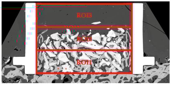 The SEM evaluation was carried out by sequentially scanning polished surfaces. The images were automatically fused with the Zeiss Atlas 5 software and processed with ImageJ to calculate the percentage of new bone formation (NBF %) with respect to the total area of the region of interest and the percentage of bone–biomaterial contact (BBC %) in the different regions of interest. The internal space of the cylinder was divided horizontally into three regions of interest (ROI) of 1.3 mm height each, from proximal to distal: ROI1, ROI2, and ROI3 (Figure 3). We decided to discard ROI3 for histomorphometric analysis since the amount of biomaterial remaining in this region was negligible in all cylinders, meaning that this region was of no interest to our study. Therefore, we analyzed ROI1—more proximal to the rabbit’s calvaria—and ROI2—corresponding to the middle area of the cylinder and the region more distal to the animal’s calvaria of the two examined.