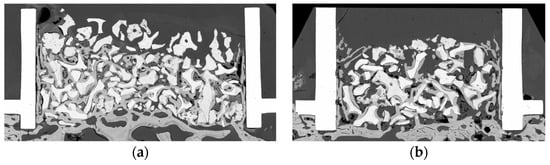 These results are in line with those obtained previously by Viteri-Agustín et al. [], who studied the effect on bone regeneration in the vertical direction by applying different biomaterial compression forces in a model of a critical defect in a rabbit calvaria. Despite not observing statistically significant differences between the different compression forces, they did obtain significantly higher percentages of bone neoformation in the regions closest to the calvaria in both groups, albeit with lower values (29.0 ± 8.8% in the cases of lower compression forces and 27.6 ± 8.2% in the cases of higher compression forces) than the cases in our study. When performing the histomorphometric analysis, the zones of interest were established by dividing the entire inner zone of the cylinder into internal and external zones. In our case, we interpreted the results by dividing the sample into three thirds and discarding the external one, so logically, our internal region of interest showed higher newly formed bone values, as the sample was from a smaller region and closer to the native bone. Even so, the values we obtained in terms of bone tissue formation were much higher than those obtained in studies on rabbit calvarias using similar methodologies with deproteinized mineral xenografts of bovine origin, where bone neoformation percentages of between 11.7 and 13.8% were obtained [,].