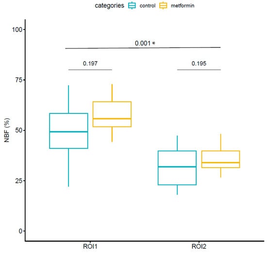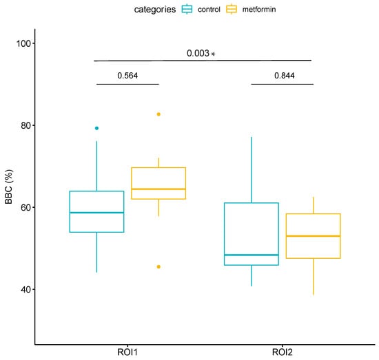 Histomorphometric measurements of the bone–biomaterial contact percentage (BBC %) in each region of interest, represented by box plots. The median, percentiles, and maximum and minimum values of each group are shown. At the top, we can see the p-values obtained after applying the paired t-test comparing cases treated with metformin and controls within each region of interest and comparing the two regions of interest overall; “*” indicates statistically significant differences.