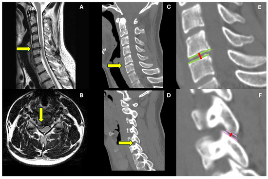 Case illustration—radiological measurements. This is an illustrative case of a 32-year-old male suffering from C5-6 right paramedian cervical disc herniation, determining C7 radicular pain and triceps palsy. In (A,B), sagittal and axial t2-weighted 1.5 T MRI, respectively, we see identified by the yellow arrow the herniated disc and no significant degenerative condition of the rest of the cervical spine. In (C,D), we find the CT scan exam, including sagittal median (C) and lateral (D) cuts. The (E) is a zoomed image of the C5-6 level, where we illustrate how we measure di discal space height (red line) at the mean point of the opposite endplates (green lines). The (F) is a zoomed visualization of the zygapophyseal joint; in this the joint rims are identified by the pink lines, and the distance is measured at their mean point (red line).