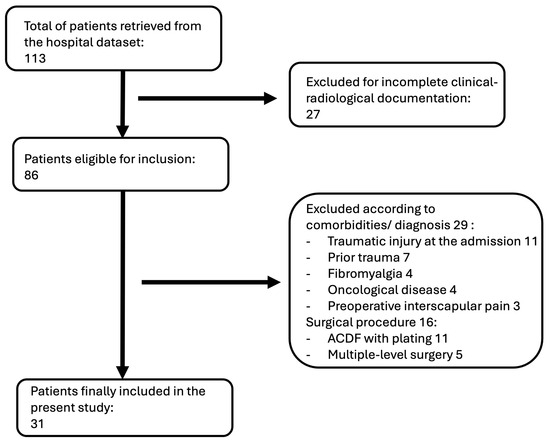 Patients were considered for eligibility if complete medical–radiological documentation was available on the informatic system. The following inclusion criteria were adopted: age > 18 years, single cervical level disc herniation determining cervical nerve root palsy and cervical myelopathy, and cervical-brachial pain from three months after failing the conservative treatment, clinical follow-up 12 months. Exclusion criteria were a history of previous cervical spine surgery or traumatic injuries prior to the current hospitalization, interscapular pain or ache at the cervical–thoracic junction reported during the pre-operative evaluation, fibromyalgia, oncological disease, or surgical procedure different from single-level ACDF without plating. A time range for screening was set from January 2019 to December 2022.