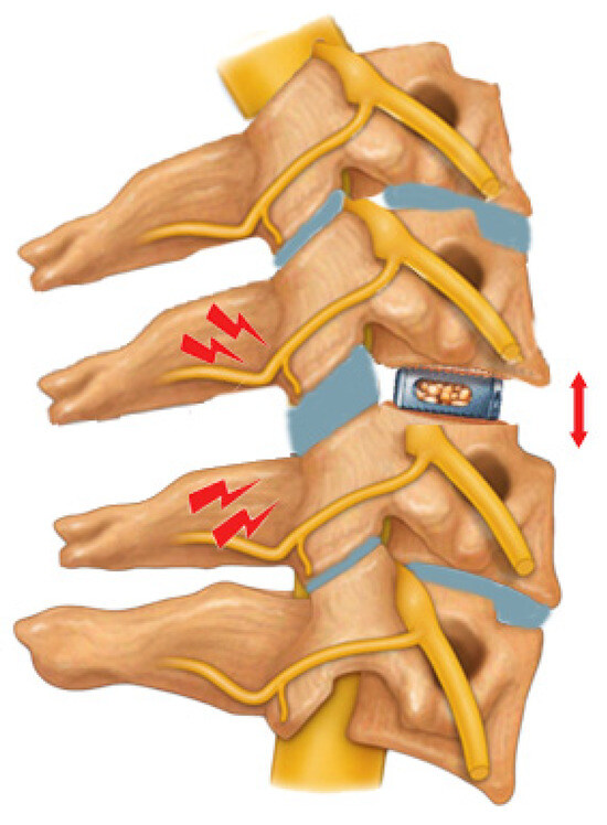 Zygapophyseal joints over distraction after ACDF and post-operative interscapular pain. In this drafting, the cage is implanted at the herniated disc level, according to the ACDF technique. The red arrow highlights how the oversized implant increases the intervertebral space height compared to contiguous ones, and this determines some degree of posterior over-distraction of the segmental zygapophyseal joints and their capsule, which may underlie the post-operative interscapular pain occurrence.