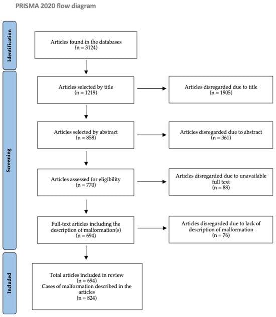This systematic review commenced in February 2021 and was completed in April 2023. The selection process started with a total of 3124 articles. This process included two exclusion phases: the first phase consisted of selecting articles by title that showed the presentation of a malformation, which was independently performed by the three authors, and collecting the articles that had been selected by at least two of the three authors, thus narrowing the search to 1219 articles (39% of the initial sample); the second phase consisted of selecting articles, by summary, whose content focused on the description of the malformation, limiting the search to 858 research articles (27% of the initial sample), which have been individually evaluated for data extraction. This second phase was carried out by one author, and the others checked for agreement.