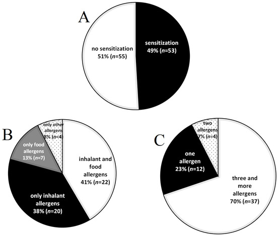 Prevalence of sensitization to allergen extracts and molecules in children with coeliac disease (n = 108). (A) The percentage of sensitized (black area) and not sensitized (white area) children. (B) The percentage of children sensitized only to food (grey area), inhalant (black area), inhalant and food (black area), or other (dotted area) allergens. (C) The percentage of children sensitized to one (black area), two (dotted area), or more (white area) allergens. Sensitization was assessed in blood sera of children using the ALEX®2 test with the cut-off point of ≥0.3 kUA/L for a positive result.