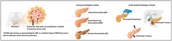 Type 3c diabetes mellitus (T3cDM) is a distinct type of DM that occurs in the context of diseases of the exocrine pancreas. It is also known as pancreoprivic, pancreatogenic, or secondary DM (secondary to diseases that affect the pancreas exocrine compartment) []. The most common etiologies for T3cDM include acute pancreatitis (AP), acute recurring pancreatitis (ARP), chronic pancreatitis (CP), cystic fibrosis (CF), as well as understudied causes such as pancreatic resections, cancer, or genetic disorders [,].