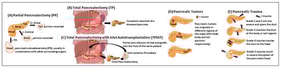 Surgical methods for pancreatectomy, locations of cancer in the pancreas and grading for pancreatic trauma. The choice of pancreatic surgery is based on the underlying cause and the relevant pancreatic anatomy. The pancreas can be broadly divided into head, body and tail regions. (A) Partial pancreatectomy (PP) involves resecting either: (i) the head region in combination with some of the surrounding organs (e.g., pancreaticoduodenectomy, PD); (ii) the body region (for a central pancreatectomy, which is not commonly performed); or (iii) the tail region for a distal pancreatectomy (DP, sometimes performed in combination with the body region). (B) A total pancreatectomy (TP), often used to treat chronic pancreatitis and pancreatic cancers, is a complex surgical procedure where the entire diseased pancreas is excised, and involves removal of other surrounding organs, vessels and lymph nodes. One of the major limitations of this procedure is life-long dependence on exogenous insulin and enzyme replacements. (C) T3cDM is a major challenge after a TP procedure. In some cases, a simultaneous islet auto transplantation (IAT) procedure is performed after TP. This dual TPIAT therapy helps to preserve endogenous beta cells and insulin secretion to alleviate post-TP-induced DM. For IAT, the remaining functional islet cells from a diseased organ are recovered by digesting the pancreas with tissue dissociation enzymes to obtain an islet equivalent volume. The harvested islet autografts are then reimplanted into the host liver via portal vein infusion. (D) In the context of pancreatic cancers, a tumor can originate in the head, body or tail regions of the pancreas. The development of T3cDM can occur anywhere along the progression of disease spectrum, beginning with an inflammatory insult. Some types of pancreatic cancers include the Pancreatic Ductal Adeno Carcinoma (PDAC), pancreatic NeuroEndocrine Tumors (pNETs), Intraductal Papillary Mucinous Neoplasms (IPMNs) and the Mucinous Cystic Neoplasms. (E) T3cDM can also occur after pancreatic trauma, with traumatic injuries graded (1–5) based on the severity of the injury.