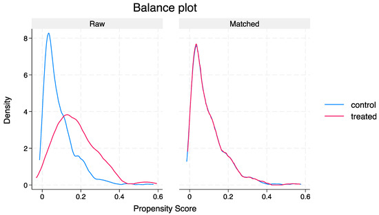 Distribution curve before and after propensity score matching.