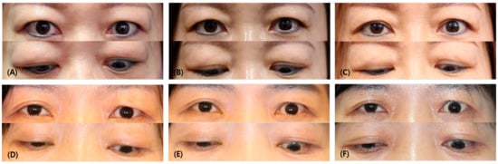 - Costa, P.G.; Saraiva, F.P.; Pereira, I.C.; Monteiro, M.L.; Matayoshi, S. Comparative study of Botox injection treatment for upper eyelid retraction with 6-month follow-up in patients with thyroid eye disease in the congestive or fibrotic stage. Eye 2009, 23, 767–773. [Google Scholar] [CrossRef]