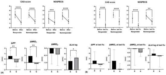 Difference in CAS, NOSPECS score, and eyelid position parameters before and after injection in responders and non-responders. (A) After 1 month following injection, (B) last follow-up. Average last follow-up period was 11.0 ± 11.6 months. R, responder; N, non-responder (*: p < 0.05, **: p < 0.01, ***: p < 0.001, ****: p < 0.0001).