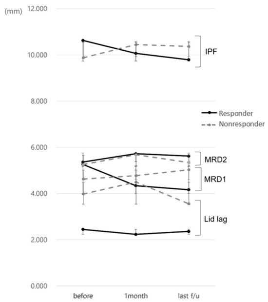 The responder group had a decrease in MRD1 of more than 1 mm during the first month after injection, while the non-responder group had a decrease of less than 1 mm, no difference, or an increase in MRD1. The IPF before injection was 10.63 ± 1.08 mm and 9.88 ± 0.73 mm in the responder and non-responder group, respectively, with IPF being greater in the responder group (p = 0.039) and the IPF difference before and after injection being higher in the responder group (0.56 ± 1.10 mm, −0.57 ± 0.88 mm, p = 0.002). The difference between MRD1 levels prior to and following injection was 0.92 ± 0.96 mm, which was also significantly higher in the responder group (−0.15 ± 0.75 mm, p < 0.001). There was no statistical significance when compared to the most recent value after injection, but there was a similar tendency (Figure 2 and Figure 3).