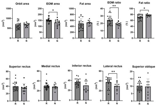 The cross-sectional area of the orbit and each extra ocular muscle, the ratio of the area of the extra ocular muscle to the orbit area, and the ratio of the area of fat to the orbit area in responders and non-responders (*: p < 0.05, **: p < 0.01).