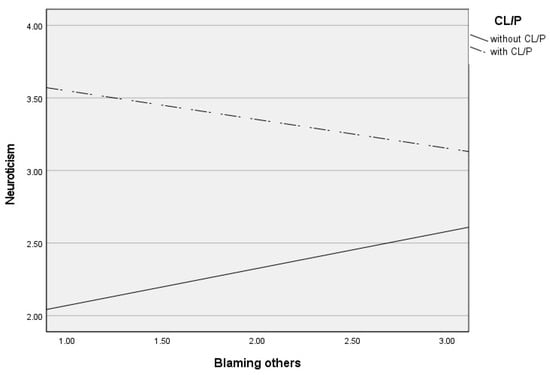Differential effects between blaming others and neuroticism depending on CL/P and without CLP group.