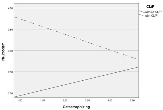 Differential effects between catastrophizing and neuroticism depending on CL/P and without CLP group.