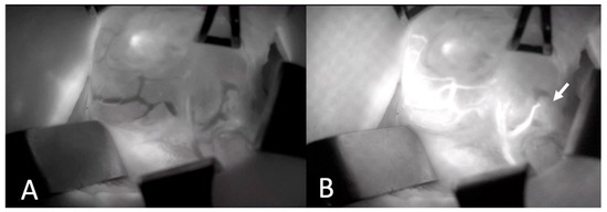 Intraoperative Images of Thyroid Gland and Parathyroid Gland Vascularization Before (A) and after (B) ICGA. Arrow depicts lower parathyroid gland with intact vascularization (ICGA: Indocyanine green angiography).