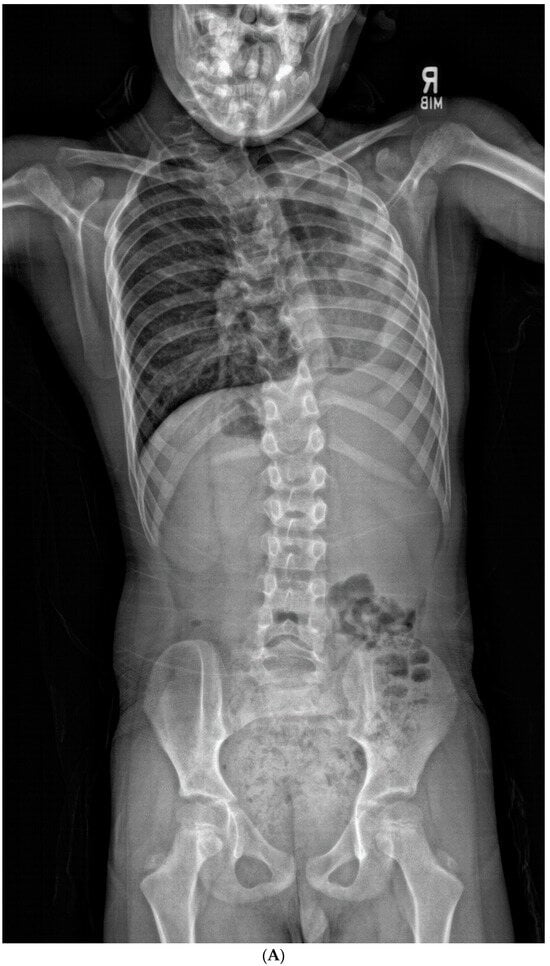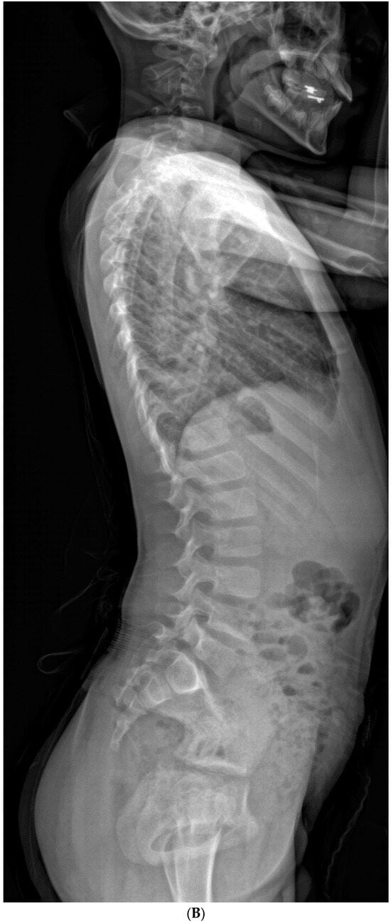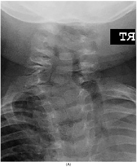 Congenital scoliosis accounts for approximately 10% of all pediatric scoliosis and encompasses a heterogeneous spectrum of disorders resulting from abnormal vertebral development during early gestational development [1,2,3]. Unlike other causes of scoliosis in children (neuromuscular, syndromic, idiopathic), congenital scoliosis presents unique challenges in presentation and management. Broadly categorized as either failure of formation or failure of segmentation, these anomalies lead to spinal growth disequilibrium and can subsequently lead to spinal deformity [3,4,5]. Many of these conditions are extremely rare, and often coincide with abnormalities in other organ systems, such as in the case of VACTERL and Klippel–Feil syndrome. Even rarer collagenopathies (e.g., osteogenesis imperfecta), skeletal dysplasias (e.g., Larsen syndrome, Goldenhar syndrome), and mucopolysaccharidoses (e.g., Morquio syndrome) can all lead to significant deficiencies in spinal development and growth [6,7]. Spinal deformity in congenital scoliosis most commonly manifests in the thoracolumbar spine, and progression occurs most rapidly in the first 3 years of life [4,5]. Cervical spine involvement is encountered less frequently [8,9,10,11,12], although certain diagnoses such as Klippel–Feil syndrome account for a disproportionate number of cases of congenital cervical scoliosis (CCS) [11].