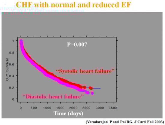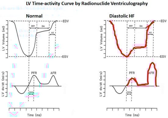 The fact that heart failure (HF) can occur despite a normal left ventricular (LV) ejection fraction (EF) was first described in the early 1980s [,]. It was observed in these patients, based on radionuclide ventriculography showing LV time–volume curves, that early LV filling was impaired, with a greater contribution from atrial contraction, and the term “diastolic heart failure” was coined (Figure 1). Subsequently, this was changed to HF with preserved EF (HFpEF) because of the complexities of the measurement of LV diastolic function []. Diastolic HF was initially thought to be associated with a better prognosis compared to systolic HF based on Framingham data [], but it was subsequently shown to be as sinister as or worse than systolic HF, especially in hospitalized class IV patients with HF (Figure 2) []. We would like to summarize the growth in the understanding of LV diastolic function (Table 1).