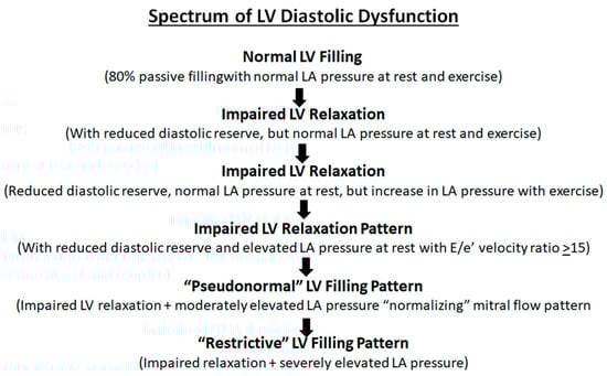 Spectrum of left ventricular (LV) diastolic dysfunction: proposed progression from normal diastolic function to progressive impairment of LV relaxation and compliance with clinical worsening at each stage. LA = Left atrium.