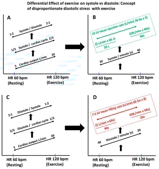 (A–D) Differential stress on diastole vs. systole when the heart rate is increased. During exercise, the cardiac output increases as a result of the increase in the heart rate (HR) and stroke volume. In this example, the resting HR of 60 bpm and cardiac output of 5 L/min increased to 120 bpm and 20 L/min, respectively. At rest, diastole occupies about 2/3 of the cardiac cycle, and with exercise, only 1/3 of the cardiac cycle, placing disproportionate stress on LV filling and requiring a higher filling rate than the LV ejection rate. In this example, the ejection rate just had to double, but the mean filling rate had to increase by 8 folds, stressing the need for diastolic efficiency and why even early LV disease will manifest because of LV dysfunction.