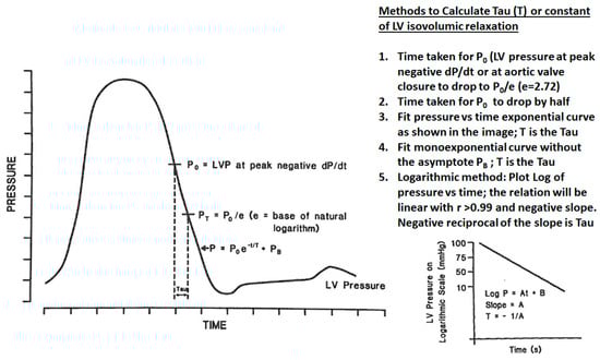 Measurement of Tau: Tau is a mathematical description of the rate of LV pressure decay after aortic valve closure or peak negative dP/dt. Various methods of computing it are listed in the figure, but the monoexponential method is the standard one. It has to be kept in mind that the pressure tracings should be of a high quality, with a high-frequency response system, and this is typically obtained by micromanometer tipped catheters, which have a frequency response of 200 Hz.