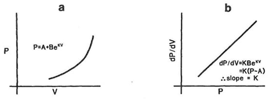 Measurement of LV compliance. (a) As the LV fills passively in the latter stage of diastole, the rate of the pressure rise depends on the degree of filling; hence, instantaneous compliance is volume-dependent. The pressure (P)–volume (V) relationship is exponential, as shown in (a). A and B are constants and K is referred to as the modulus of LV chamber stiffness. K is a number that is volume-independent and fundamentally describes the viscoelastic properties of the LV. To obtain this, you need a simultaneous recording of the LV diastolic pressures with a micromanometer tipped catheter (not fluid-filled, which has a frequency response <10 Hz) and LV volumes by contrast angiography at 60 fps or obtained by conductance catheter coupled with the micromanometer pressure tip. (b) As the instantaneous rate of the pressure rise (dP/dV) depends on the instantaneous volume and/or pressure, mathematics from (a) shows that the relationship between diastolic dP/dV and P is linear and the slope of this linear equation is the modulus of chamber stiffness, K.