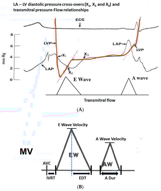 (A) Transmitral pressure–flow (P–F) relationships are poorly understood and the simplified Bernoulli equation does not apply in this situation as the pressure gradient is mainly used to accelerate the flow and the negative pressure gradient to decelerate the flow. When the LV pressure (red) drops below the LA pressure (black) at pressure cross-over X1, the transmitral flow starts and the gradient basically accelerates the transmitral flow. As the LV fills and the pressure in the LV equals that in the LA, X2 occurs when the pressure gradient is zero, but the E wave velocity is at the peak despite a zero pressure gradient. Between X2 and X3, the LV pressure is higher than that of LA and this negative gradient retards the mitral flow, resulting in its deceleration. It can be inferred from this P–F relationship that if the LV relaxation is slower, both the positive and negative gradients would be lower and the pressure cross-overs would be delayed, resulting in the slower acceleration of E wave, lower E wave amplitude and slower E wave deceleration, resulting in longer mitral E wave acceleration and deceleration times as well. On the other hand, higher LA pressure or very efficient LV relaxation as occurs in children would do just the opposite. (B) Schematic showing various measurements from the transmitral flow velocity profile by pulsed wave Doppler at the mitral leaflet tips: LV isovolumic relaxation time (IVRT) between the end of LV ejection or aortic valve closure (AVC) and the start of mitral inflow (typically 70–100 ms), mitral E wave velocity, E wave deceleration time (EDT, normally 160–250 ms), mitral A wave velocity and A wave duration (A dur, normally about 100 ms). The normal E/A velocity ratio in adults is typically between 1 and 1.5. In children, it can be >10, resulting physiological S3, and in elderly < 1, resulting in physiological S4. MV = Mitral valve flow.