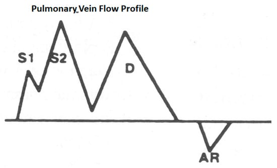 Schematic of pulmonary vein flow: S1 is a systolic wave produced because of left atrial relaxation causing a suction force, S2 is a systolic wave because of mitral annular descent stretching the left atrium and also right ventricular ejection transmitted through a low resistance, short pulmonary circulation D wave because of left atrial emptying when the mitral valve opens and the AR wave, which is a reflux into the pulmonary vein because of left arial contraction. Generally, the S waves are taller than the D waves, the transitions are smooth and the AR wave duration is a measure of the duration of left atrial systole, which is normally about 100 ms.