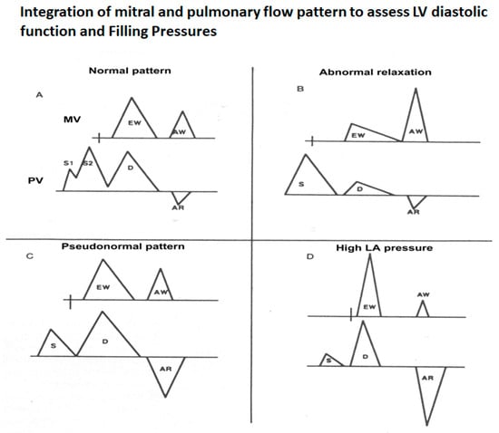 Schematic that shows how to interpret the mitral and pulmonary vein flows as a unit. (A) Normal pattern–IVRT 70–100 ms, E/A velocity ratio 1.0 to 1.5, E wave deceleration time 160–250 ms, S wave higher than D wave and AR wave duration same or less than that of the A wave duration. (B) Pattern of abnormal LV relaxation–IVRT >100 ms, E/A ratio <1, E wave deceleration time >250 ms and more prominent S wave because of the diminutive D wave secondary to the smaller E wave. (C) Pseudonormal pattern that is a combination of impaired LV relaxation and elevated left atrial pressure—these two work in opposite directions to normalize the mitral flow. But the clue is changes in pulmonary vein flow—mainly, the AR wave duration, which will be greater than the mitral A wave duration by >30 ms, indicating longer atrial systole, a marker of elevated LV end-diastolic pressure. Reduced LA compliance may also reduce the S wave amplitude. (D) Severely elevated LA pressure characterized by short IVRT (<70 ms), E/A velocity ration >2, E wave deceleration time <150 ms, S wave shorter than D, D wave deceleration time <170 ms and exaggerated AR wave duration and amplitude.