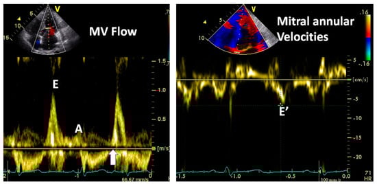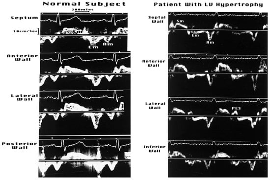 Traditionally, these velocity profiles are obtained from the medial and lateral mitral annulus using pulsed wave Doppler technology, setting the bandpass filter to capture only low-velocity, high-amplitude signals because the annular velocities are in about the 5–20 cm/s range and the signals are very intense, unlike the blood pool signals produced by moving red blood cells []. Figure 11 describes these signals and their genesis. In a normal heart, there is striking synchrony of these signals obtained from different quadrants of the mitral annulus and these are closely linked to both LV filling and ejection functions, as shown in Figure 12 and Figure 13. In myocardial disease, there may be dyssynchrony or incoordination among different myocardial walls, leading to the impairment of both systolic power generation and relaxation because of the incoordination in time and space. The annular e’ velocity is a good marker of LV relaxation and is reduced in impaired relaxation. The mitral E/annular e’ velocity ratio is a good reflection of the mean left atrial pressure, where a ratio ≥15 reflects elevated LA pressure.