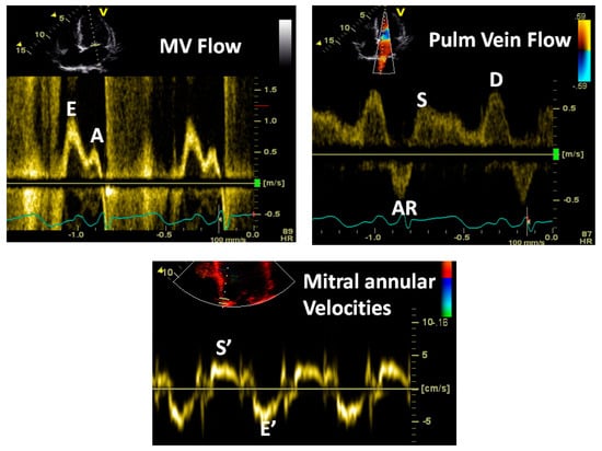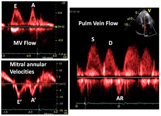 In practice, echocardiography is the cornerstone of assessing LV diastolic function and filling pressures, and to some extent, gaining insights into the myocardial structure [,,]. The tools available include the transmitral flow, pulmonary vein flow, Doppler tissue velocities of the mitral annulus, mitral E and A wave propagation inside the LV, velocity profiles or mitral and aortic regurgitation signals, left atrial size and dynamics, ultrasound elastography and myocardial backscatter analysis, etc.