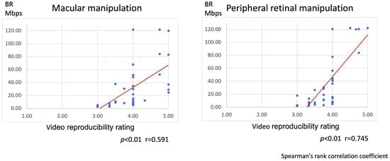 Correlation between the video bitrate and video reproducibility ratings. A positive correlation was observed between the video bitrate and effective video reproducibility for both macular manipulation and peripheral retinal manipulation. The red line represents approximate straight line.