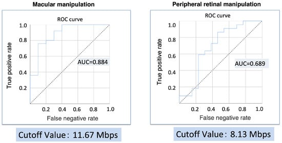 Additionally, the evaluation of the relationship between surgical reproducibility and the video bitrate (the primary outcome) indicated cutoff values of 11.67 Mbps for macular manipulation and 8.13 Mbps for peripheral retinal manipulation (Figure 2). These video bitrates were observed when the FR and Q settings were adjusted independently.