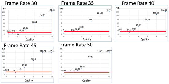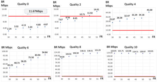 Figure 5 presents the relationship between Q and the video bitrate when a constant FR is maintained. The video bitrate of 11.67 Mbps was exceeded when Q ≥ 3 for FRs of 30, 35, 40, and 45 fps. Additionally, Q ≥ 2 was sufficient to exceed the 11.67 Mbps threshold at an FR of 50 fps.
