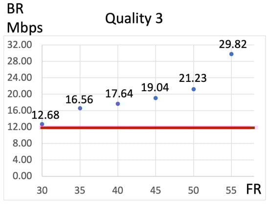 Relationship between the frame rate (FR) and video bitrate with quality (Q) set at 3. The video bitrate at Q = 3 exceeds 11.67 Mbps when the FR is set to 30 fps. The red line indicates the position where the video bitrate is 11.67 Mbps.