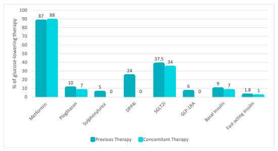 Almost all patients were already treated with a glucose-lowering therapy, specifically metformin (87%), sodium–glucose cotransporter-2 inhibitors (SGLT2i) (37.5%), DPP4i (24%), pioglitazone (10%), basal or fast-acting insulin (9% and 1.8%, respectively), GLP-1RA (6%) and sulfonylureas (5%) (Figure 1).