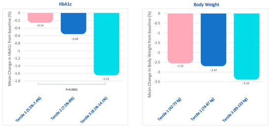 Furthermore, the study population was divided into terciles according to baseline HbA1c levels and body weight to investigate their impact on mean change in HbA1c and body weight at follow up, respectively. Comparison between multiple groups (tercile analysis) was performed by the Kruskal–Wallis test.