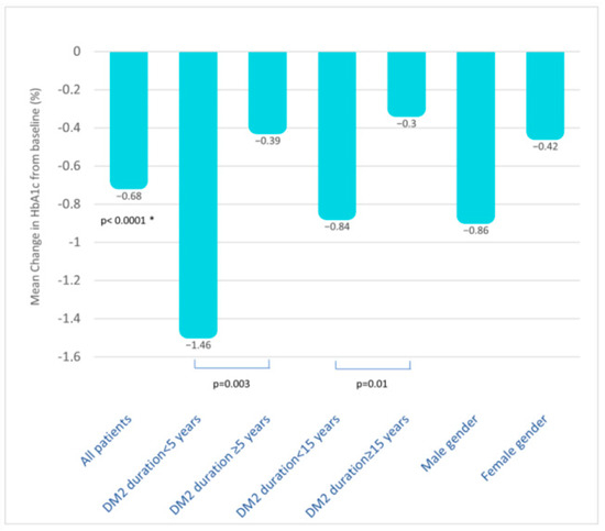 Stratification by disease duration revealed that patients with a greater reduction in HbA1c were those with a shorter disease duration (T2D duration < 5 years: −1.46%; 95% C.I. −2.15; −0.77 versus T2D duration ≥ 5 years: −0.39%; 95% C.I. −0.58; −0.19; p = 0.003); however, the effectiveness persisted, albeit slightly attenuated, in patients with a disease duration < 15 years (T2D duration < 15 years: −0.84%; 95% C.I. −1.16; −0.51 versus T2D duration ≥ 15 years: −0.30%; 95% C.I. −0.59; −0.20; p = 0.01) (Figure 3).