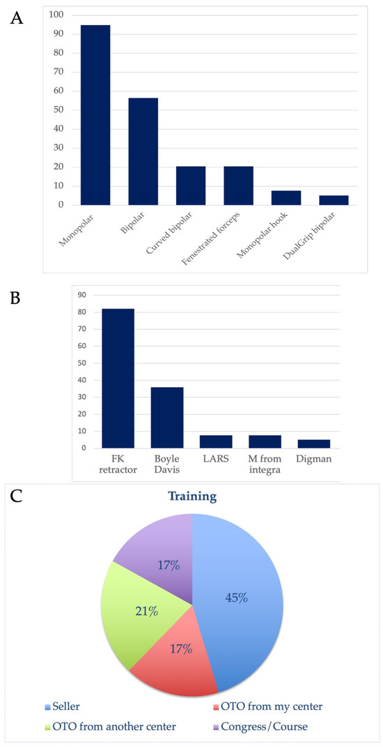 Training and instrument outcomes. The figure included the favorite instruments of TORS surgeons ((A): % of use), the mouth retractor used ((B); % of use), and the training provided (C). Abbreviations: OTO = otolaryngologist.