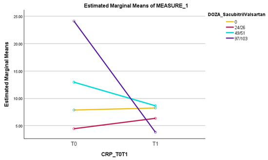 On the other hand, a statistically significant result was observed in patients receiving ARNI, regarding the dynamics of CRP (p = 0.004). The effect was different depending on the dose of ARNI: a decrease in CRP values was observed when administering the medium (49/51 mg, bi daily) and high (97/103 mg, bi daily) dose, with the greatest reduction in CRP values being reached in the case of a high dose of ARNI treatment. While for the patients who received the 24/26 mg dose bi daily and for the group of patients that did not receive ARNI at all, a slight increase in CRP levels was seen.