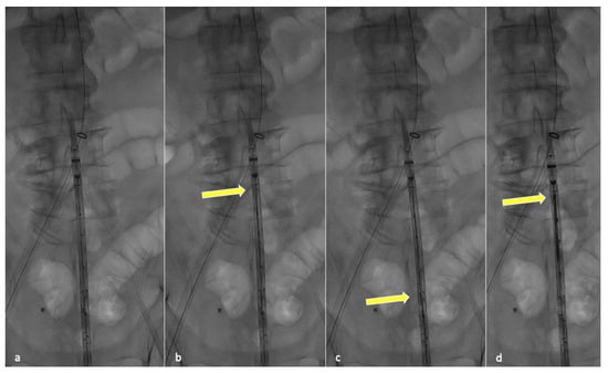 Fluoroscopic check during guidewire anticipated advancement. Graft leaning on patient body (a), yellow arrow pointing at the tip of the first positioned guidewire (b), second guidewire advancement (c) and final results after all guidewires have been correctly advanced (d).