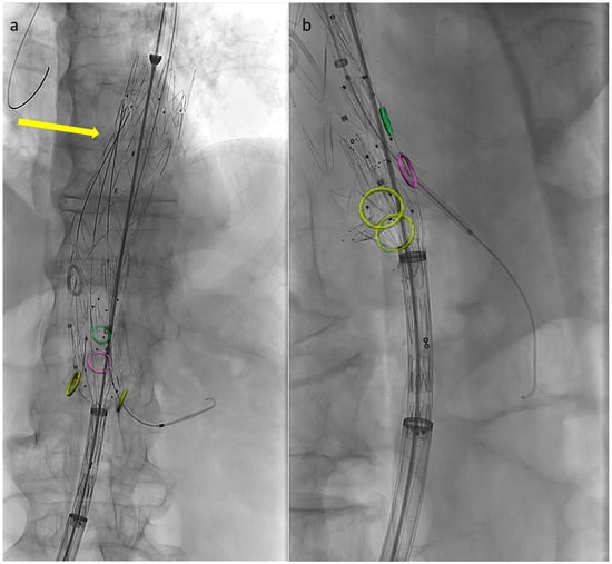 - Malekpour, F.; Scott, C.K.; Kirkwood, M.L.; Timaran, C.H. Sequential Catheterization and Progressive Deployment of the Zenith® t-Branch™ Device for Branched Endovascular Aortic Aneurysm Repair. Cardiovasc. Interv. Radiol. 2021, 44, 156–160. [Google Scholar] [CrossRef] [PubMed]