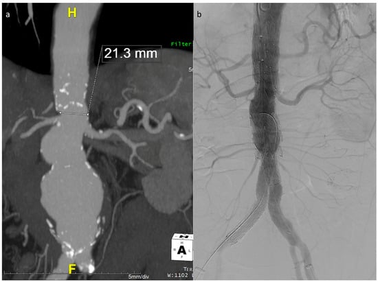- Oderich, G.S.; Forbes, T.L.; Chaer, R.; Davies, M.G.; Lindsay, T.F.; Mastracci, T.; Singh, M.J.; Timaran, C.; Woo, E.Y. Writing Committee Group. Reporting standards for endovascular aortic repair of aneurysms involving the renal-mesenteric arteries. J. Vasc. Surg. 2021, 73, 4S–52S. [Google Scholar] [CrossRef] [PubMed]