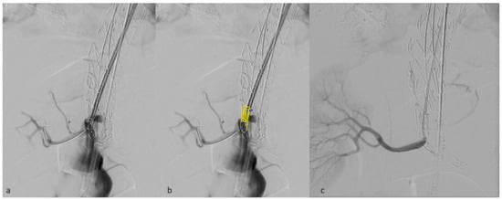 Detail of a right renal inner branch outlet used as a fenestration, deployed just in front of the target vessel ostium (a). in panel (b) inner branch characteristics have been added in post-processing. Angiographic result after bridging stent deployment (c).