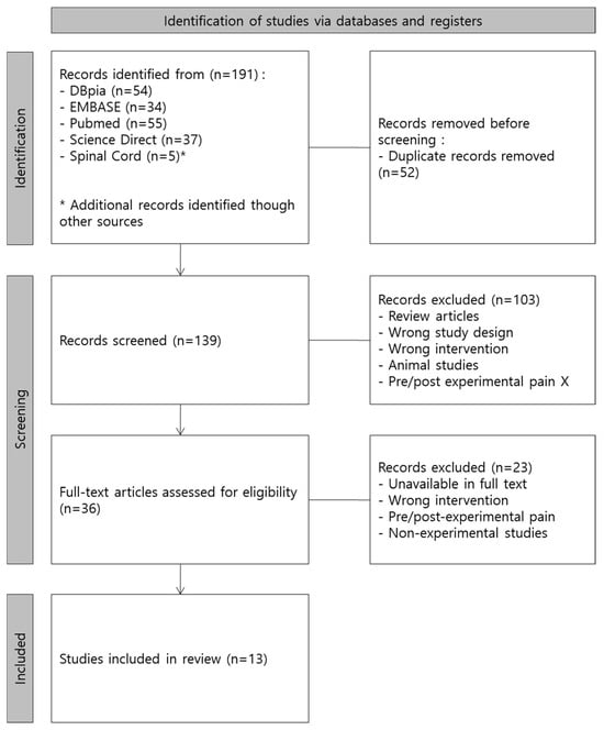 Park J, Kim J, Eun S-D, Kang D. Effectiveness of Exercise Programs for Alleviation of Upper Body Pain in Patients with Spinal Cord Injury: A Systematic Review. Journal of Clinical Medicine. 2024; 13(11):3066. https://doi.org/10.3390/jcm13113066